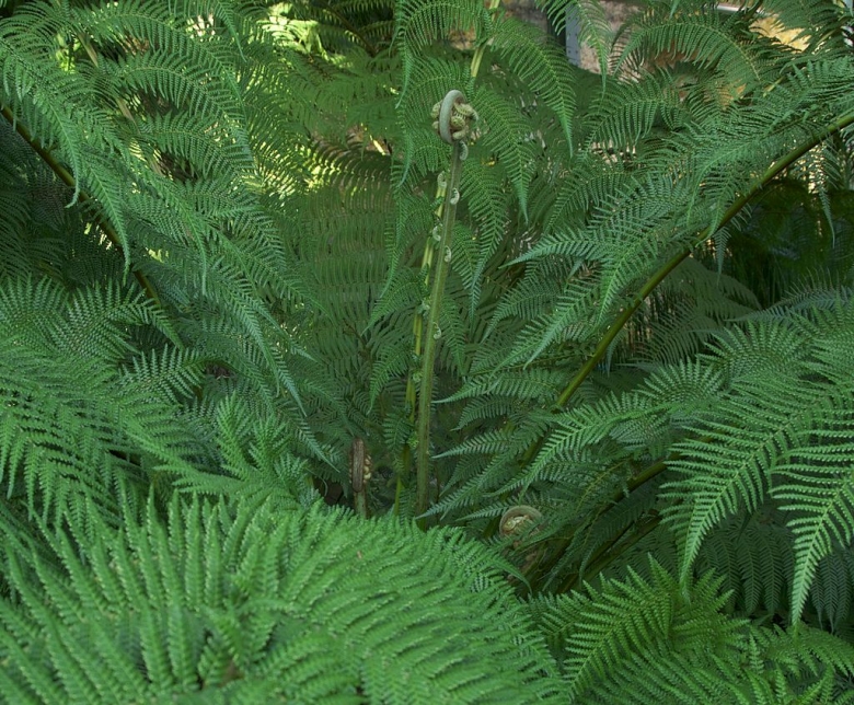 The classic tree fern with a stout, rough dark brown trunk with fronds growing from the tip, spreading up to 6m wide and 15m tall in its native environment.